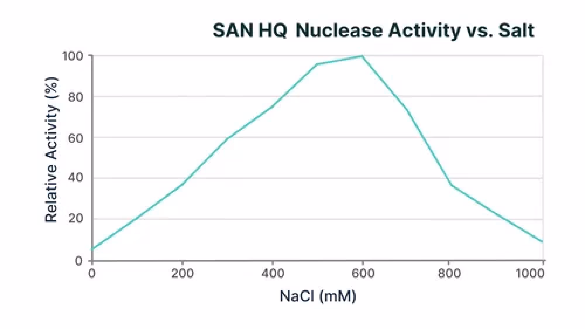 Salt Active Nuclease High Quality (SAN HQ) are bioprocessing grade nucleases developed as the most efficient solution for removal of nucleic acids, at high salt conditions. This non-specific endonuclease has peak activity at salt concentrations between 400 –650 mM.